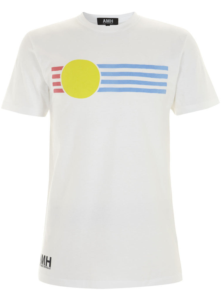 • SUNSTRIPE T-SHIRT IN WHITE WITH A RETRO INSPIRED GRAPHIC, WITH A LIGHT BLUE, LEMON AND ORANGE PRINT