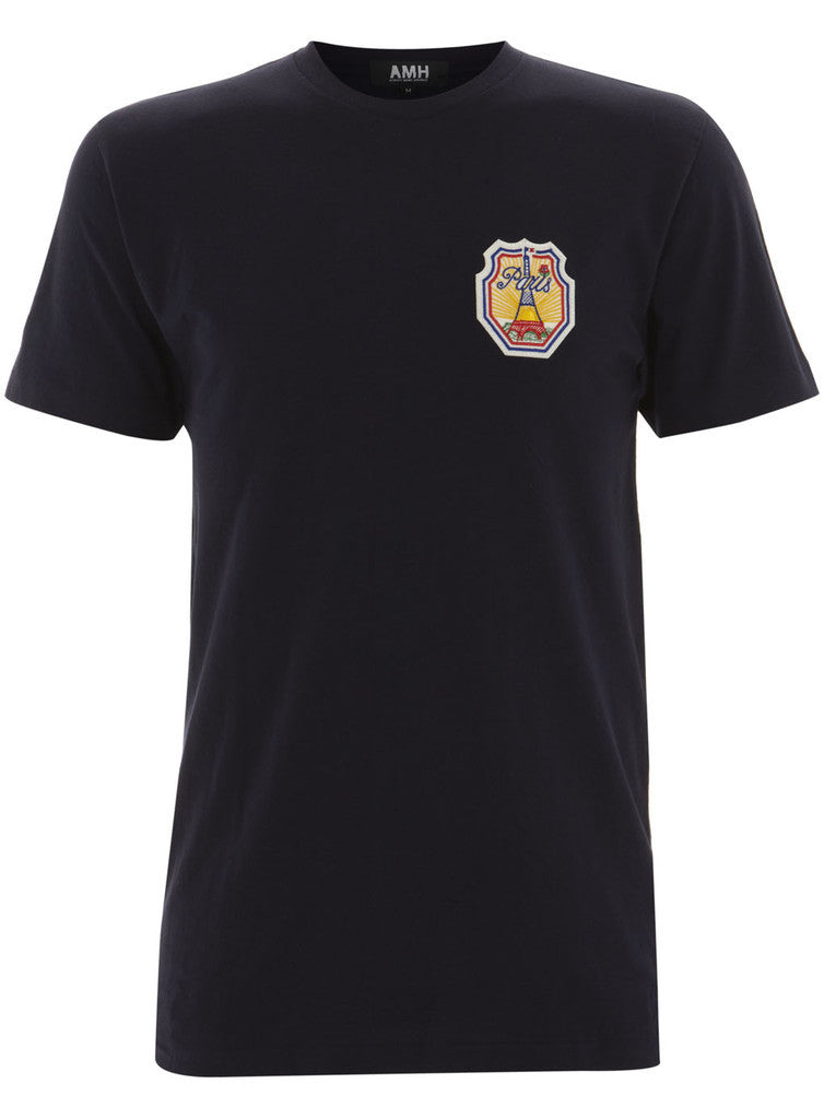 PARIS T-SHIRT IN NAVY & WHITE WITH AN EMBROIDERED BADGE OF PARIS WITH STITCH COLOURS IN BLUE, RED, YELLOW AND GREEN
